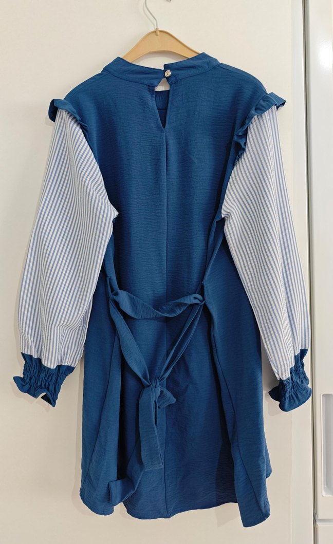 Uzun boylu, yüksek yakalı ve fırfırlı detaylara sahip mavi tunik. Çizgili uzun kollu, bol kesim rahat bir tasarım sunar. Günlük sokak stili için uygun.