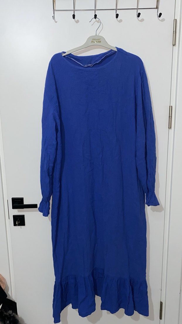 Uzun kollu, keten kumaştan yapılmış mavi elbise. Salaş kesim, yuvarlak yaka ve drapeli sade tasarım günlük kullanıma uygundur. Minimalist ve koyu tonlarda.
