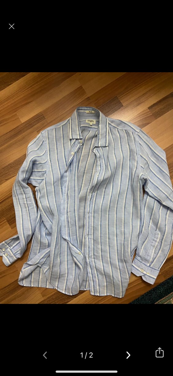Uzun kollu, yakalı ve normal kesim erkek gömlek. Yumuşak keten kumaştan, düğmeli ve mavi çizgili desene sahip, günlük sokak stiline uygun. Yurt dışı ürünüdür bedava fiyatta bana olmadığı için giyemiyorum. Hediyedir