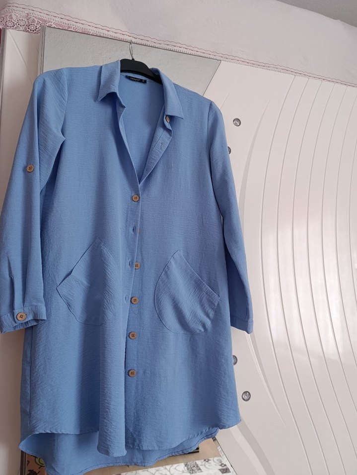 Mavi keten kumaştan uzun kollu, düğmeli ve cepli kadın gömleği. Notlu yaka ve bol kesimiyle rahat bir günlük tercih.