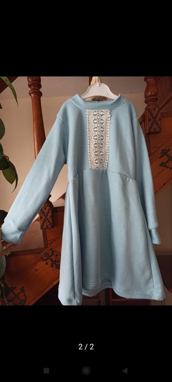 Uzun kollu, bol kesim mavi kız elbisesi, ön kısmında nakışlı dantel detayı ve yuvarlak yaka bulunur. Bohem tarzda, pastel tonlarda. göğüs 68 kol boyu 42 boy,62