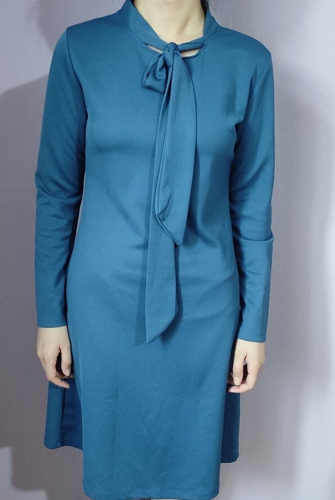 Mavi midi elbise, yüksek yakalı ve drapeli fiyonk detaylıdır. Uzun kollu, regular fit ve sentetik kumaştandır. Ofis kullanımı için uygundur.