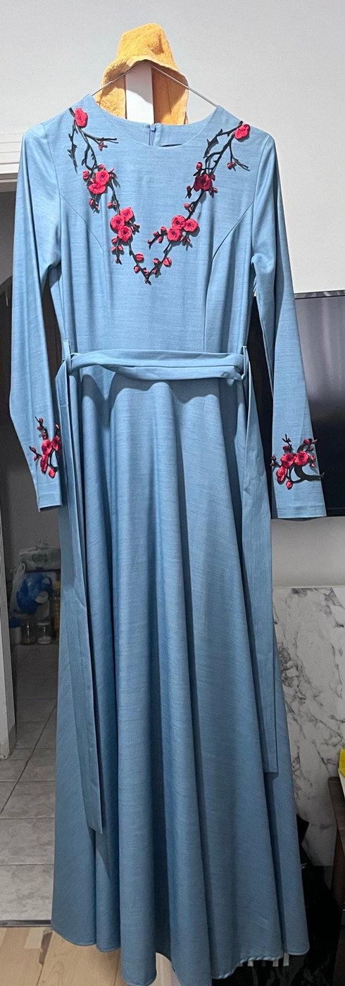 Mavi uzun elbise, uzun kollu ve V yaka tasarımıyla dikkat çeker. Nakışlı çiçek desenleri ve drapeli yapısıyla bohem, sade ve düzenli kesimdir.