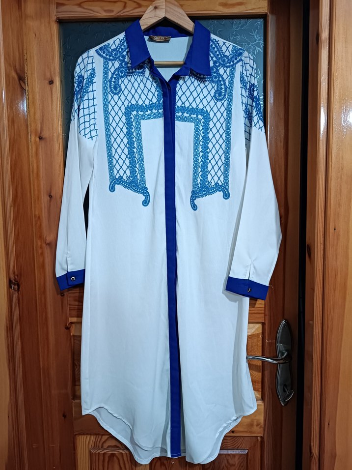 Uzun boylu, yakalı ve düğmeli, mavi nakışlı desenlerle süslenmiş hafif kumaştan bohem tarzda kadın gömleği.(en üst düğmesi yok)