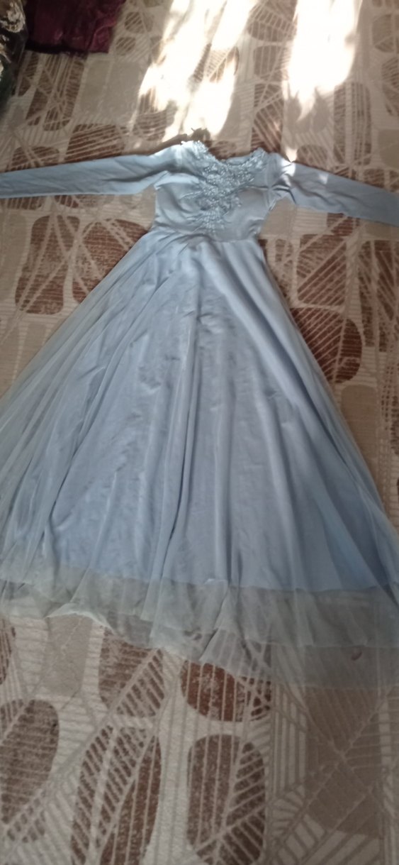 Uzun Kollu Mavi Nakışlı Drape Uzun Abiye
