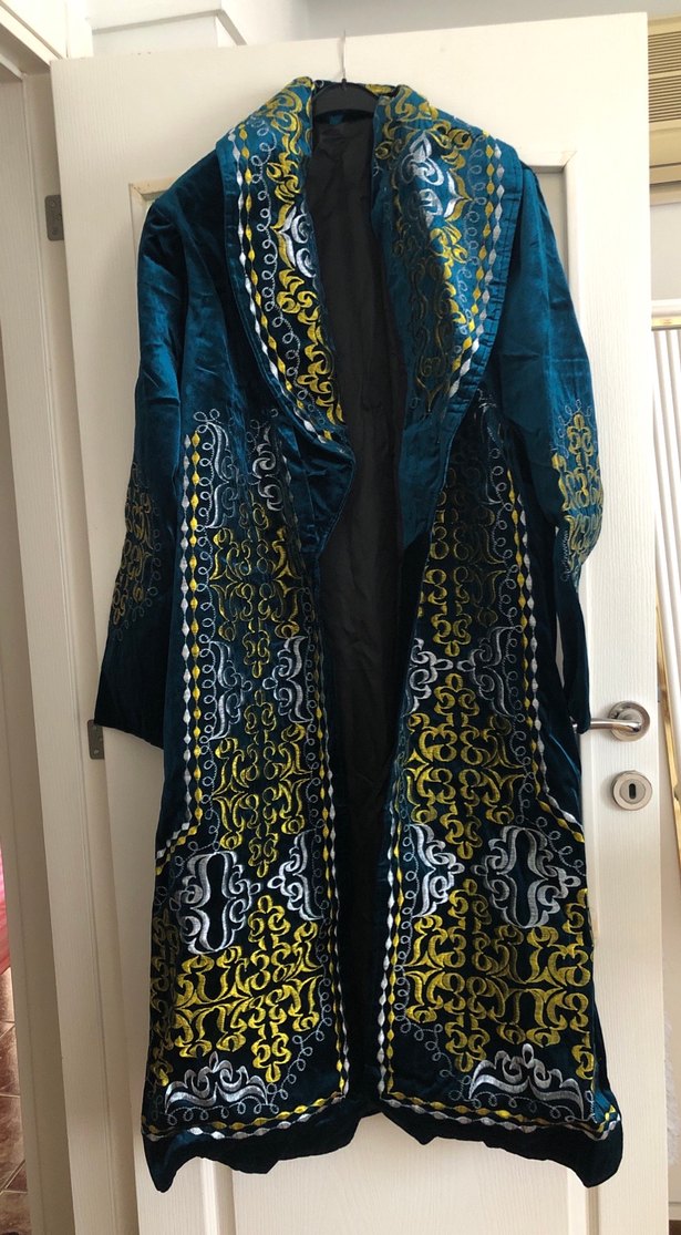 Milli,geleneksel Kırgızistan giysisi.Uzun kollu, nakışlı ve drapeli mavi renkli, bol kesim, modesta uygun elbise. Bohem tarzı ve notched lapel yaka bulunur. Beden 56