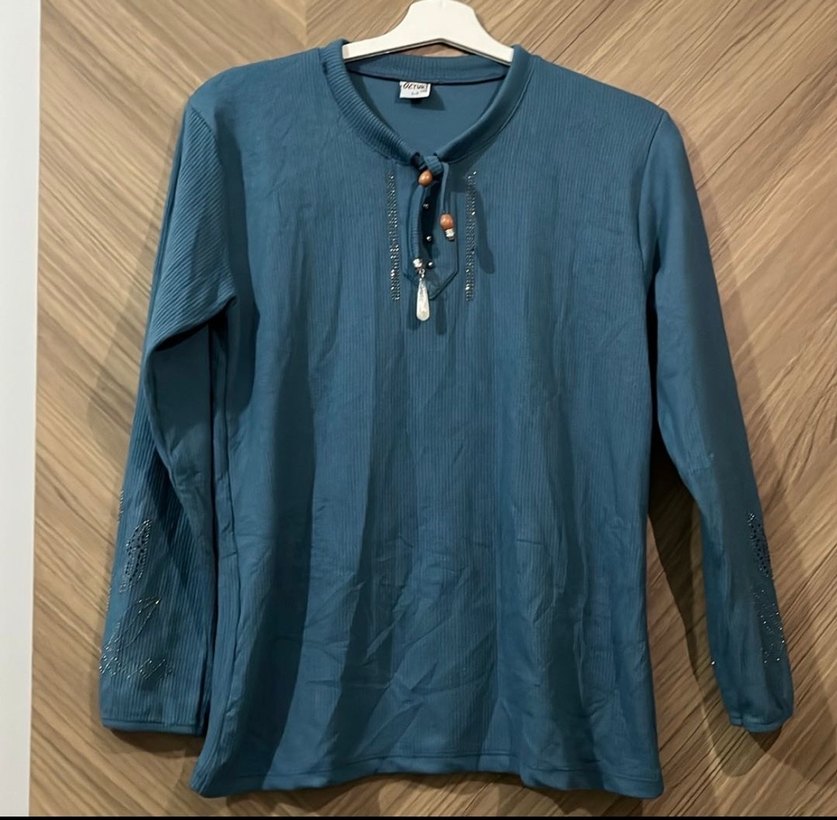 Uzun kollu, yuvarlak yakalı, nakışlı ve düğmeli detaylara sahip bol kesim mavi bluz. Yumuşak sentetik kumaştan üretilmiştir.