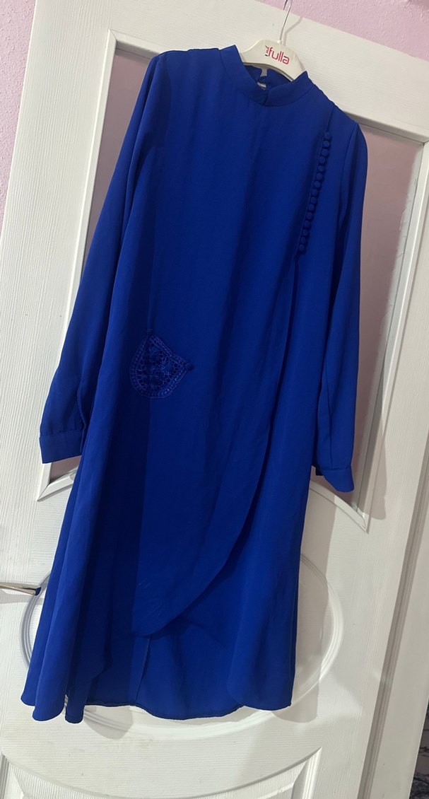 Uzun kollu, bol kesim kadın elbisesi, mavi renkte. İpek gibi kumaştan, drapeli ve nakış detaylı, sade ve mütevazı tarzda günlük kullanıma uygun.