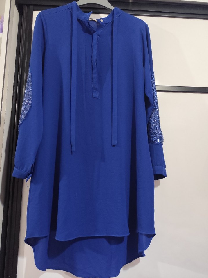 Yüksek yakalı, uzun kollu ve nakış detaylı bu mavi salaş tunik, drapeli tasarımı ve sentetik kumaşıyla rahat bir şıklık sunar. 44 ve 46 beden uyumlu