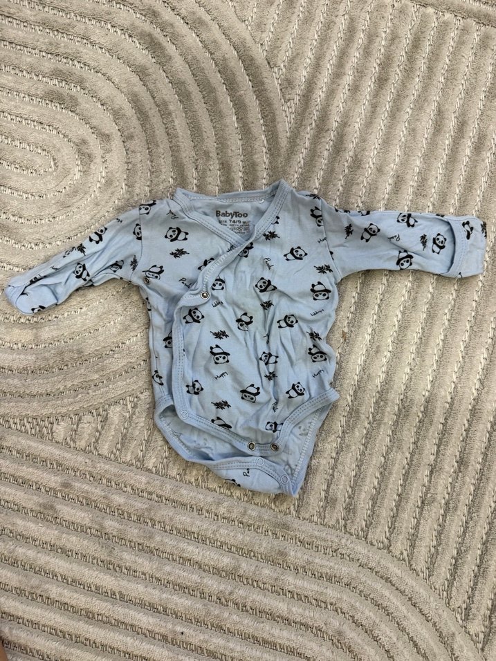 Pamuklu, uzun kollu mavi bebek body, V yaka ve düğmeli, eğlenceli desenli. Rahat ve günlük kullanıma uygun.