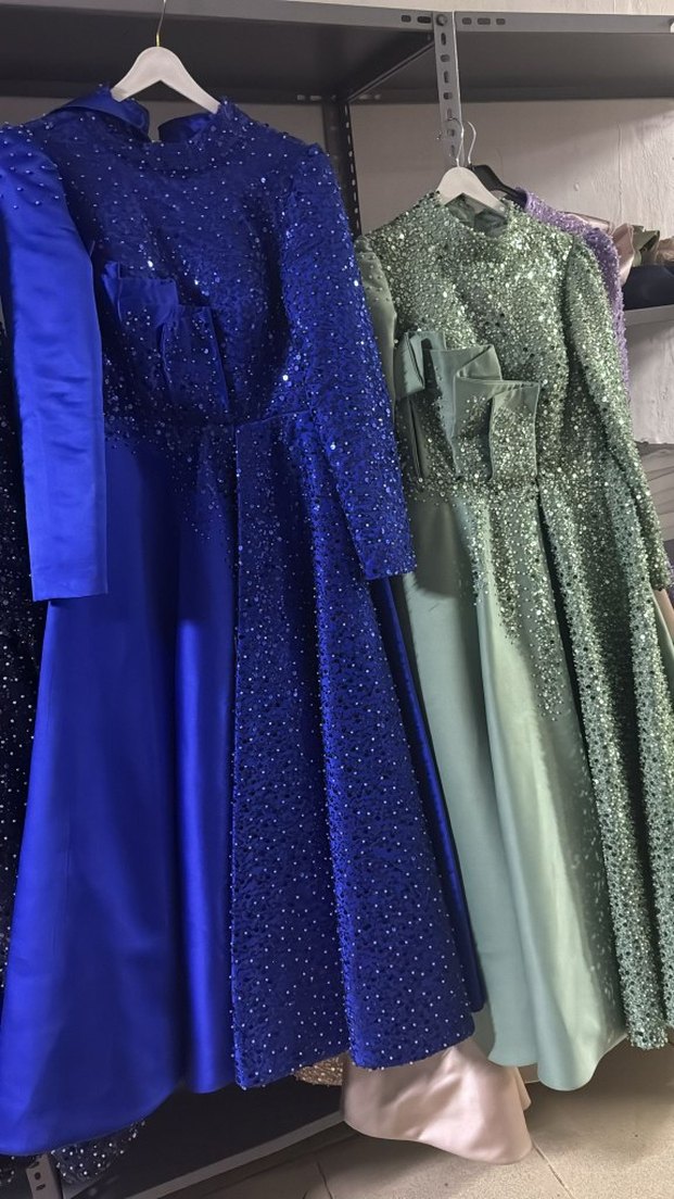 Uzun Kollu Mavi Parlak Abiye Elbise ve mont yeşili