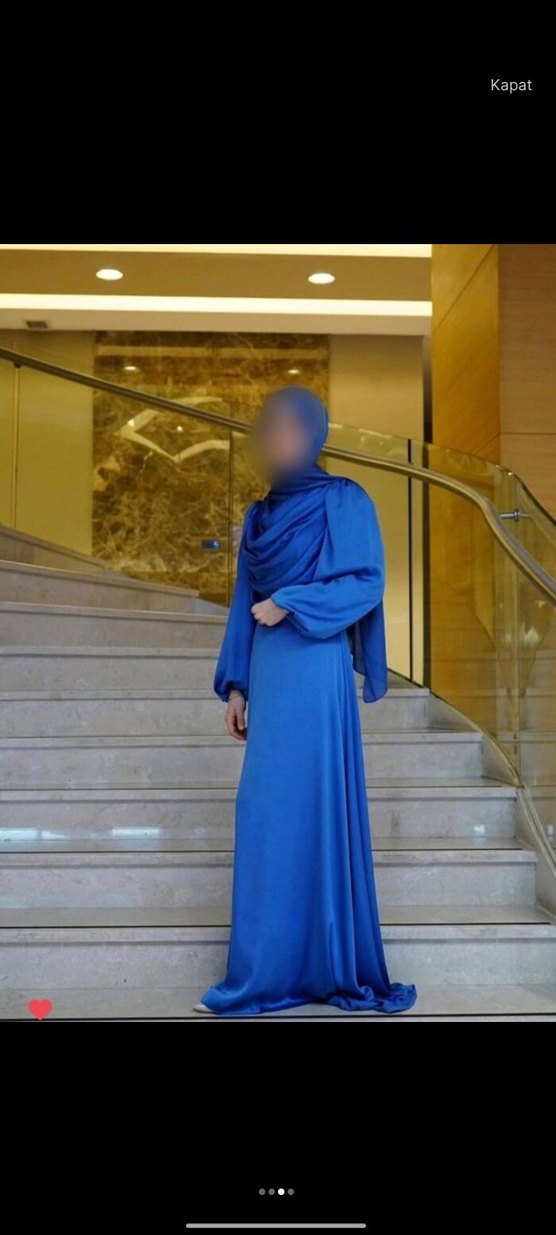 Bu dar kesim kadın abiye, yüksek yakalı ve uzun kolludur. Parlak mavi kumaştan yapılmış olup, drapeli tasarımıyla çağdaş ve tesettürlü bir görünüm sunar. Uzun boyu ve desensiz yapısıyla avant-garde tarzını yansıtır. ürün saten kumaştır