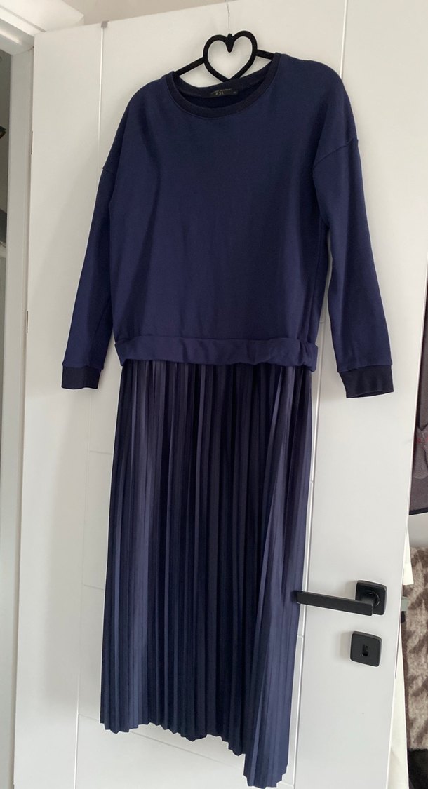 , uzun kollu, yuvarlak yakalı, pilili etekli ve bol kesimli koyu mavi kadın elbisesi. Normcore ve Parisian tarzında, günlük kullanıma uygun.