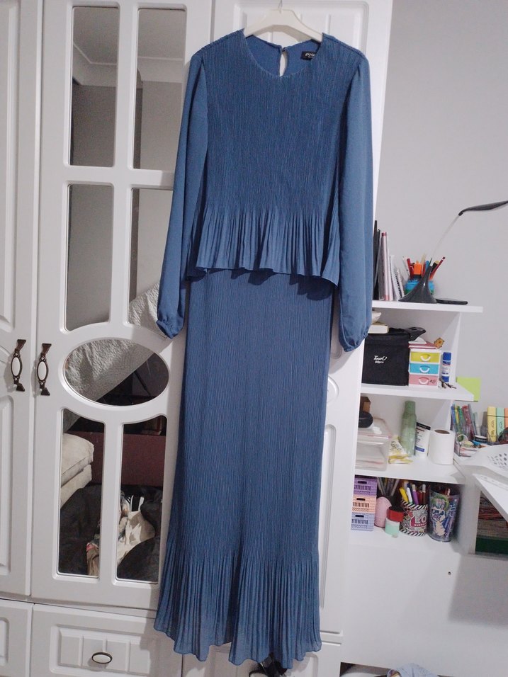 Uzun kollu, mavi pilise kumaştan yapılmış, beli ve etek ucu piliseli elbise. Düz kesim, yuvarlak yaka ve klasik Paris tarzını yansıtır. boyu 1.43 cm iki kol arası 48 cm ama esneyen bir kumas sadece 2 kez giyildi #puane marka bayan #abiyeelbise asla sorunu yok.kol altında gizli fermuarlı.arkadandan fermuarlı.