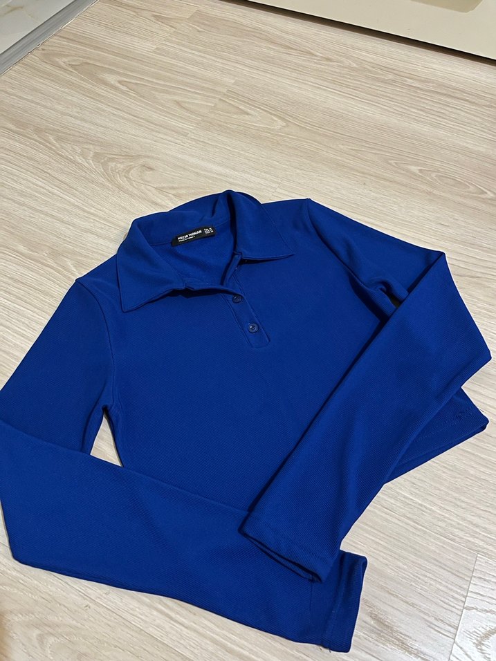 yumuşak ve sıcak kumaştan, düğmeli, yakalı, uzun kollu mavi fitted polo tişört. Sokak tarzına uygun.