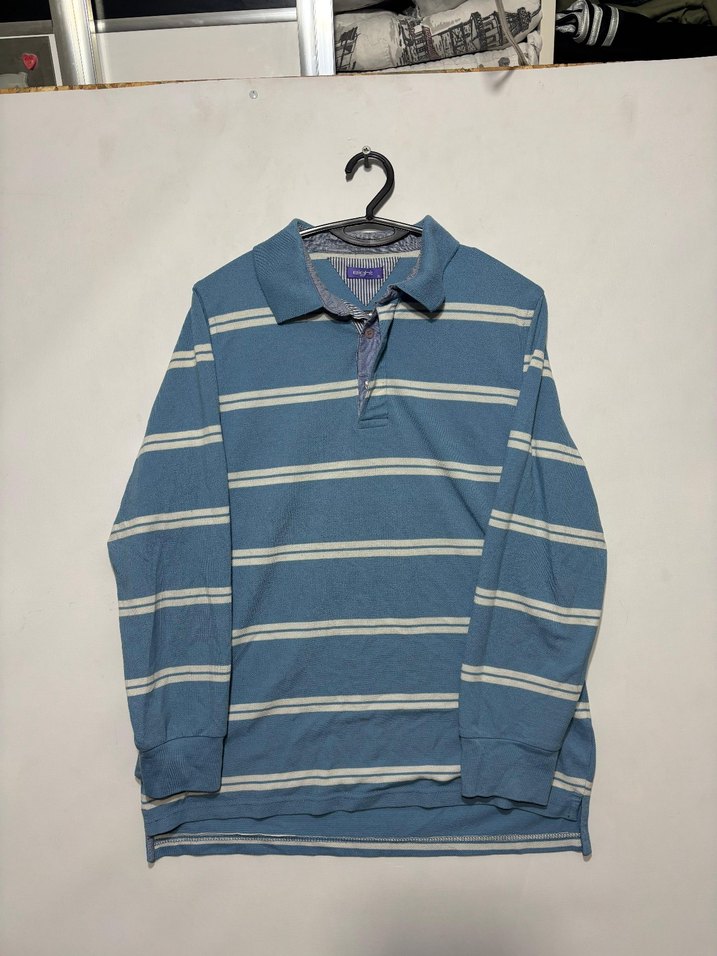Uzun kollu, düğmeli polo yaka tişört. Mavi zemin üzerine gri çizgilerle, bol kesim ve denim kumaştan günlük kullanıma uygun.