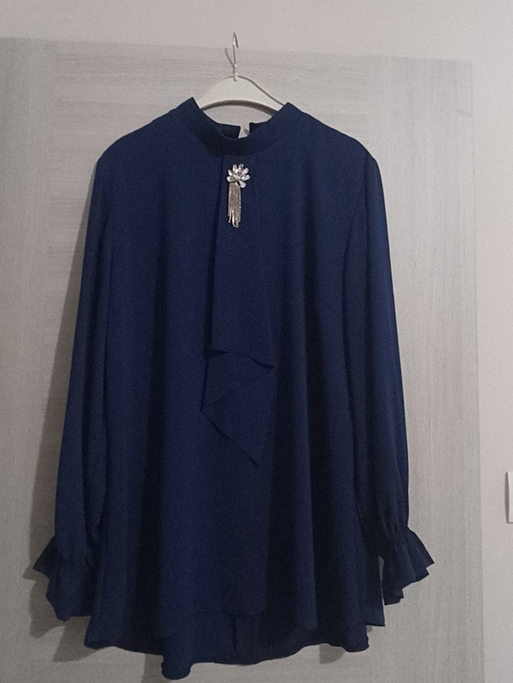 Yumuşak ve sıcak dokulu, lacivert renkte uzun, bol kesim bluz tunik. Yakası taşlı kravat detaylı ve kolları lastikli. Pembe markalı çok kaliteli ürün . Hediyeydi bedenime uymadı. Uzunluğu önden 75cm arka kısmı 80 cm . iki kol arası mesafe 55 cmdir.