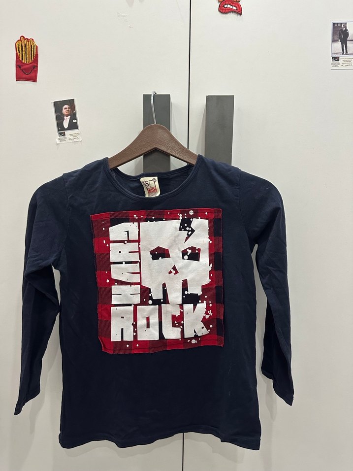 Mavi denim kumaştan, uzun kollu, bisiklet yaka, bol kesim erkek kıyafet.Önünde baskılı rock punk desen ve cırt cırt detayları bulunur.