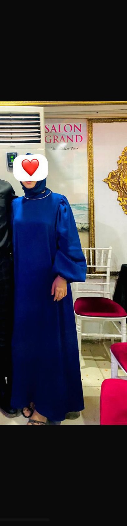 Kadınlar için uzun, yüksek yakalı ve uzun kollu salaş kesim. Koyu mavi drapeli kumaş, sade ve desensiz, mütevazı bir tarz sunar. Günlük kullanıma uygun ve dügünlere uygun
