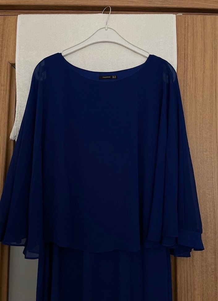 Uzun, salaş kesim mavi elbise; yuvarlak yaka ve drapeli uzun kollara sahiptir. Minimalist, desensiz tasarımı günlük kullanıma uygundur.