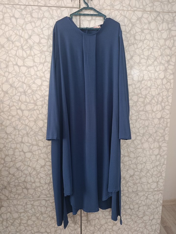 Uzun, salaş kesim mavi tunik, drapeli ve yuvarlak yakalıdır. Yumuşak sentetik kumaştan, minimalist ofis tarzına uygundur.