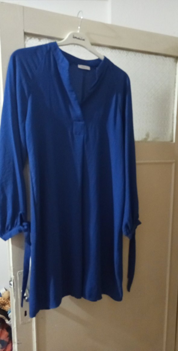 Uzun, salaş kesim mavi tunik, satenimsi kumaş ve drapeli tasarım ile V yakaya sahiptir. Uzun kollu, minimal ve bohem tarzda, günlük kullanıma uygun.