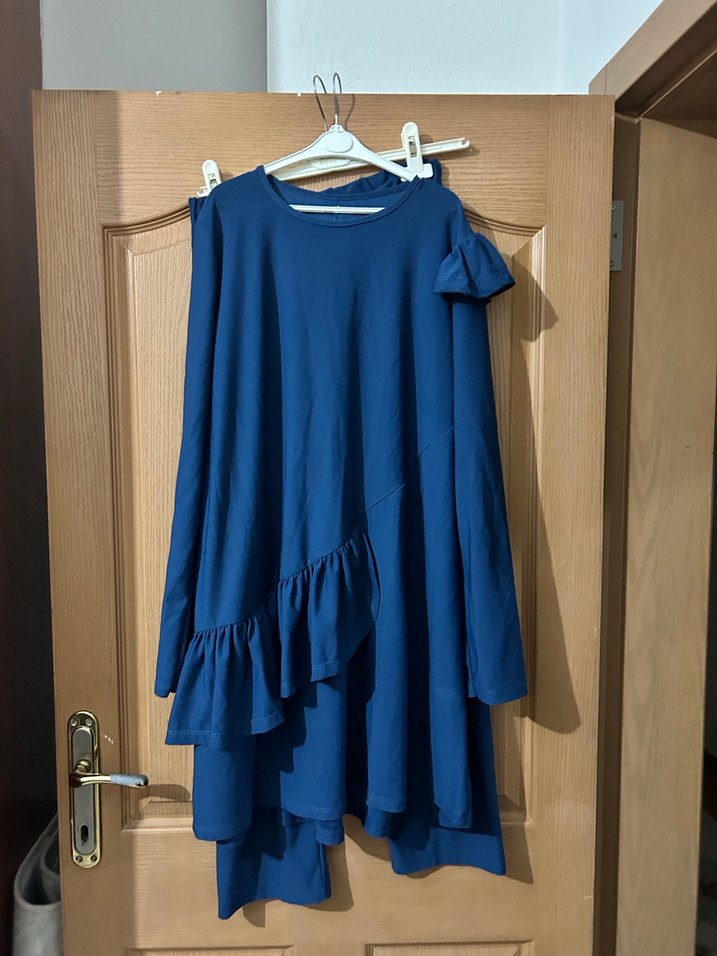 Uzun, salaş kesim mavi tunik, yuvarlak yaka ve asimetrik fırfır detaylara sahip, yumuşak sentetik kumaştan üretilmiştir.