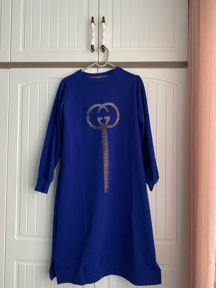 Uzun kollu, salaş kesim mavi tunik. Önünde parlak baskı ve drapeli detaylar bulunur. Yumuşak ve sıcak kumaştan üretilmiştir. Ayşe akay markadır. Boy 95 en 45 kol boy 55