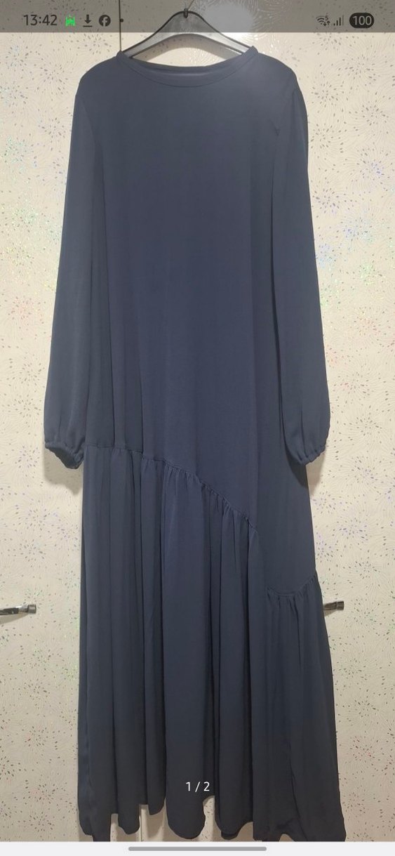 Koyu mavi renkte, yüksek yakalı ve uzun kollu salaş kesim uzun elbise. , drapeli tasarıma sahip, sade ve mütevazı tarz için uygundur.