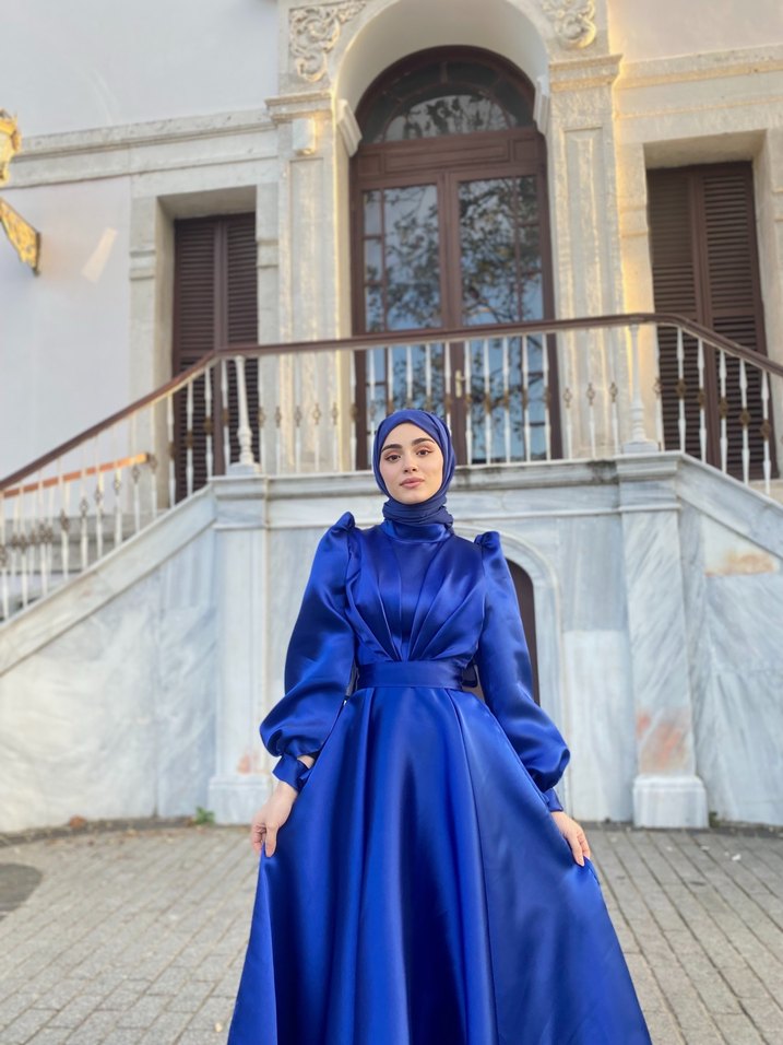 Uzun Kollu Mavi Saten Tesettür Abiye Elbise