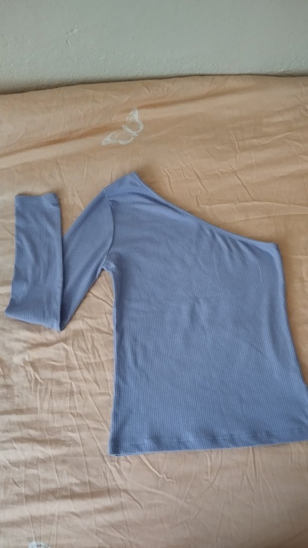 Mavi renkte, uzun kollu ve tek omuz detaylı, yumuşak sentetik kumaştan yapılmış, vücuda oturan kadın bluzu. Desensiz, rahat ve şık bir günlük kullanım parçası.