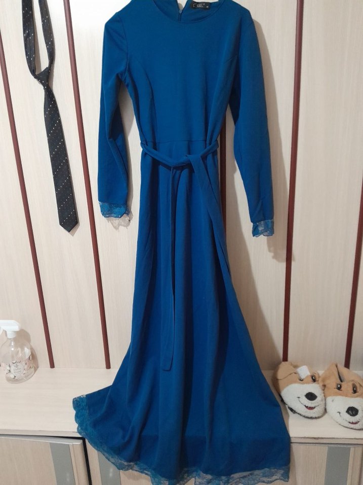 Drapeli ve notched lapel yakalı, uzun kollu mavi elbise. Sentetik kumaştan, sade ve bohem tarzda, tesettür için uygun.