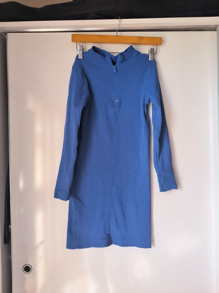 Uzun kollu, yüksek yaka ve fermuarlı, dar kesim mini triko elbise. Yumuşak ve sıcak kumaştan, koyu mavi renkte, minimal ve zahmetsiz şıklık sunar. Günlük kullanım için uygun.