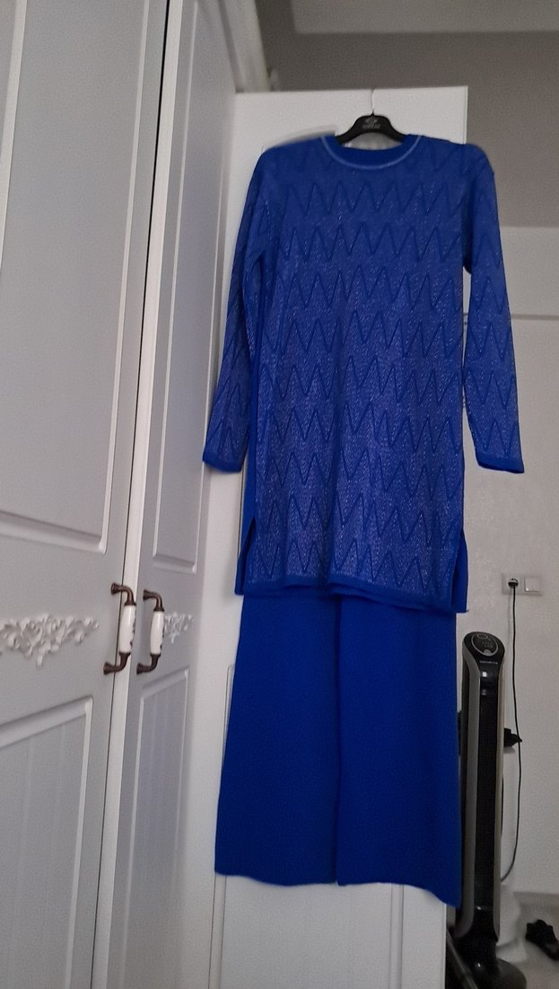 Uzun kollu, mavi renkte,simli triko kumaştan yapılmış, yuvarlak yakalı, pantolon tunik. takım