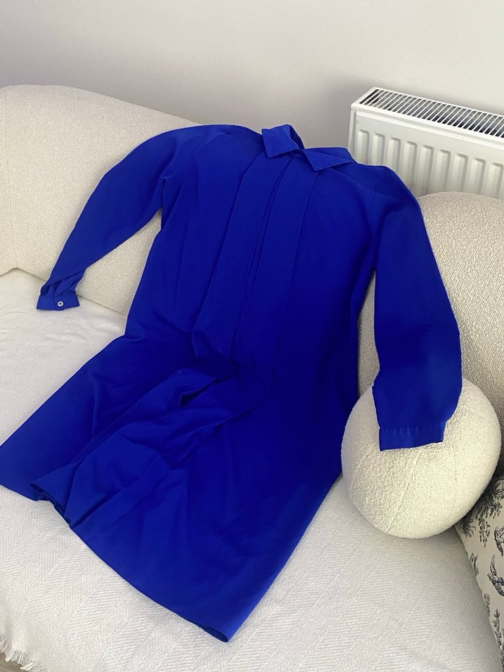 , yakalı ve düğmeli ön kısmıyla, koyu mavi yumuşak ve sıcak kumaştan üretilmiştir. Günlük kullanım için sade ve desensiz tasarıma sahiptir.