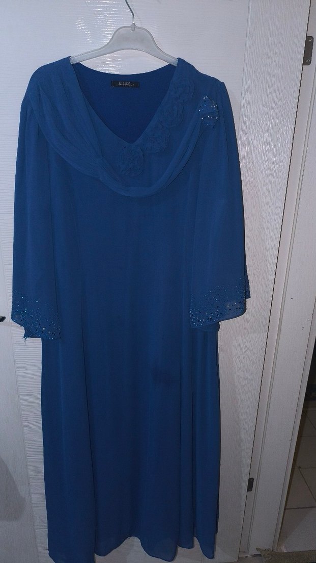 Uzun Kollu Mavi V Yaka Salaş Abiye Elbise