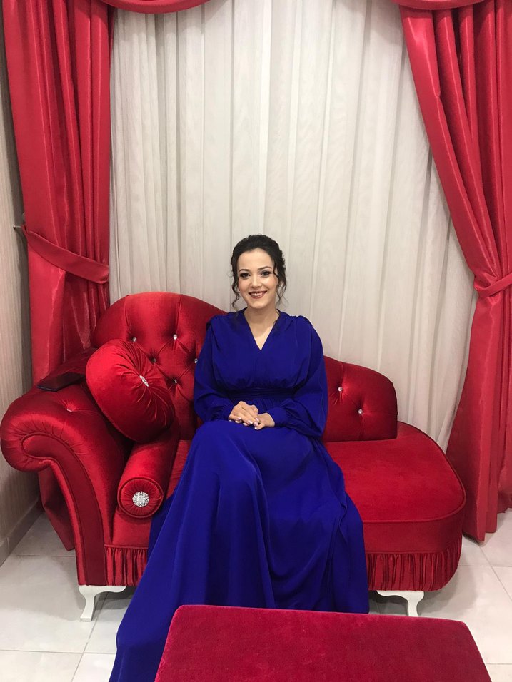 Uzun kollu, V yakalı ve drapeli mavi elbise. Etnik desenli, normal kesim, mütevazı ve gösterişli tarzda, düğün gibi özel günler için uygundur.