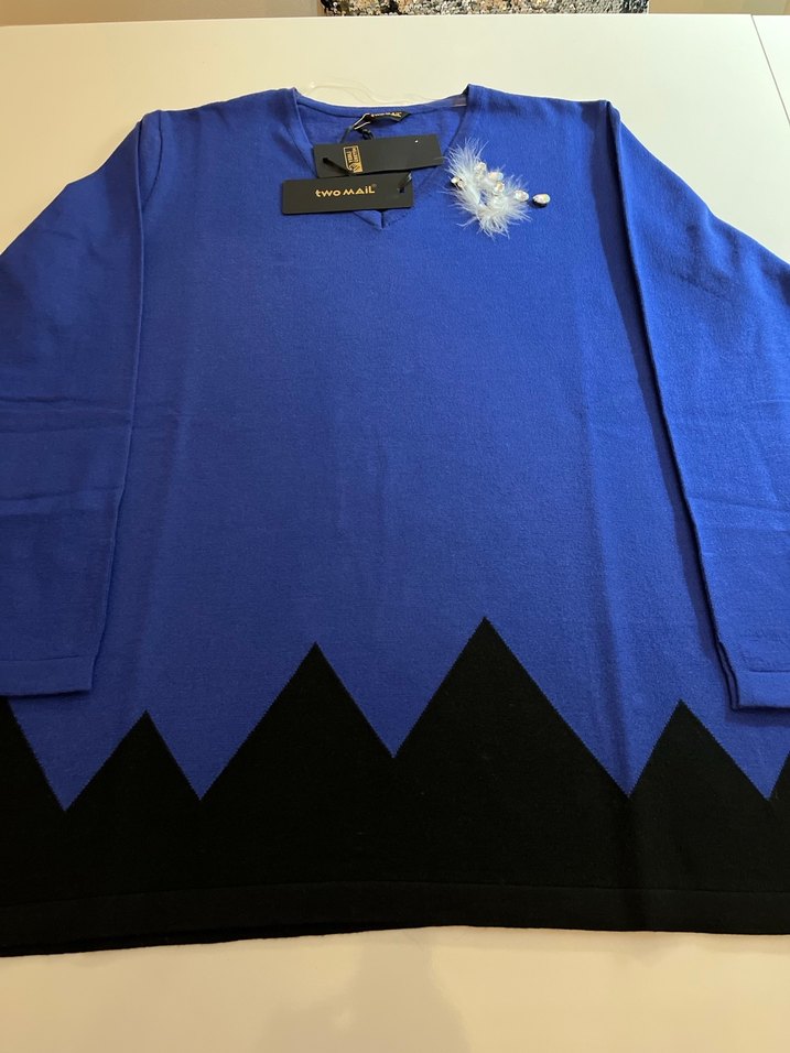 Kadınlar için uzun kollu, V yakalı, bol kesim ve uzun boy triko kazak. Yumuşak ve sıcak kumaştan örülmüş, koyu mavi renkte, etek kısmında siyah baskı deseni ve yakada tüy detayı bulunur.