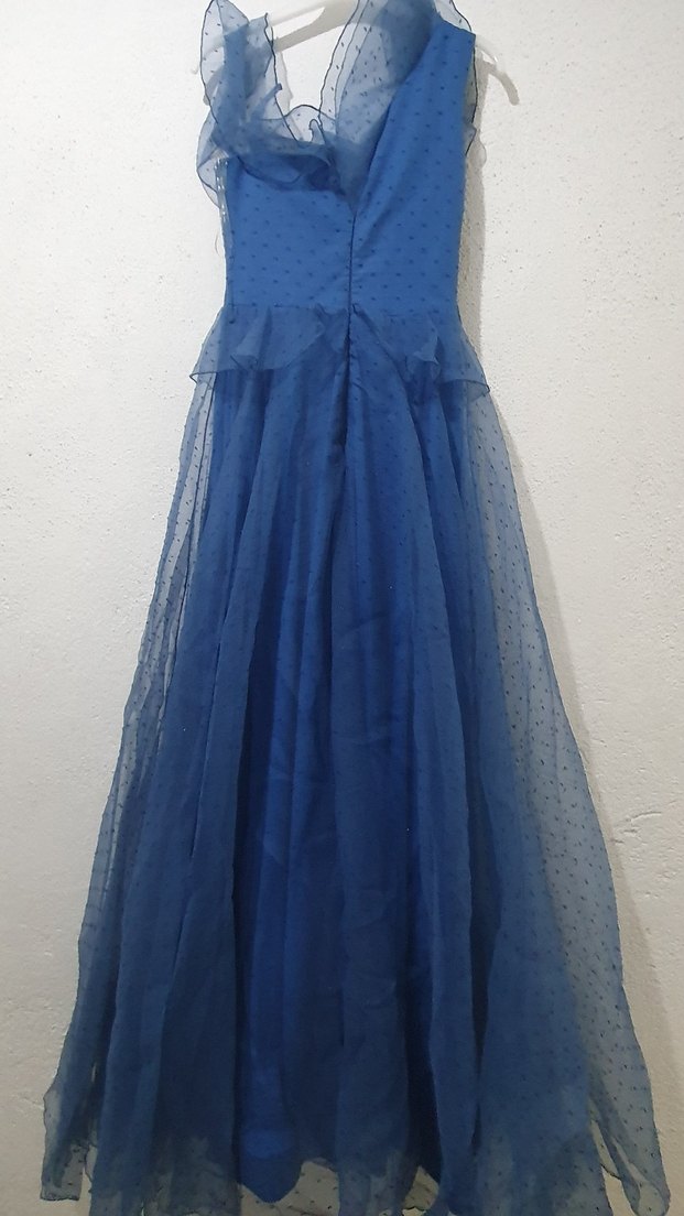 Uzun Kollu Mavi Vintage Abiye Elbise