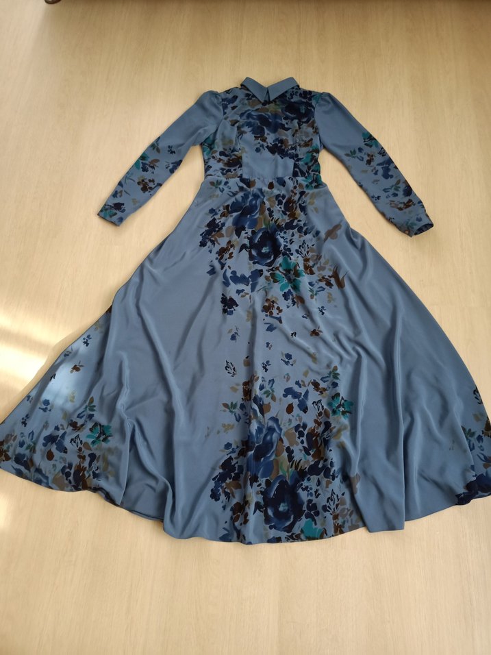 Yüksek yakalı, uzun kollu ve bol kesim bu uzun elbise, yumuşak sentetik kumaştan vintage çiçek baskılıdır. Dökümlü tasarımıyla bohem tarzı sunar, düğünler için uygundur.