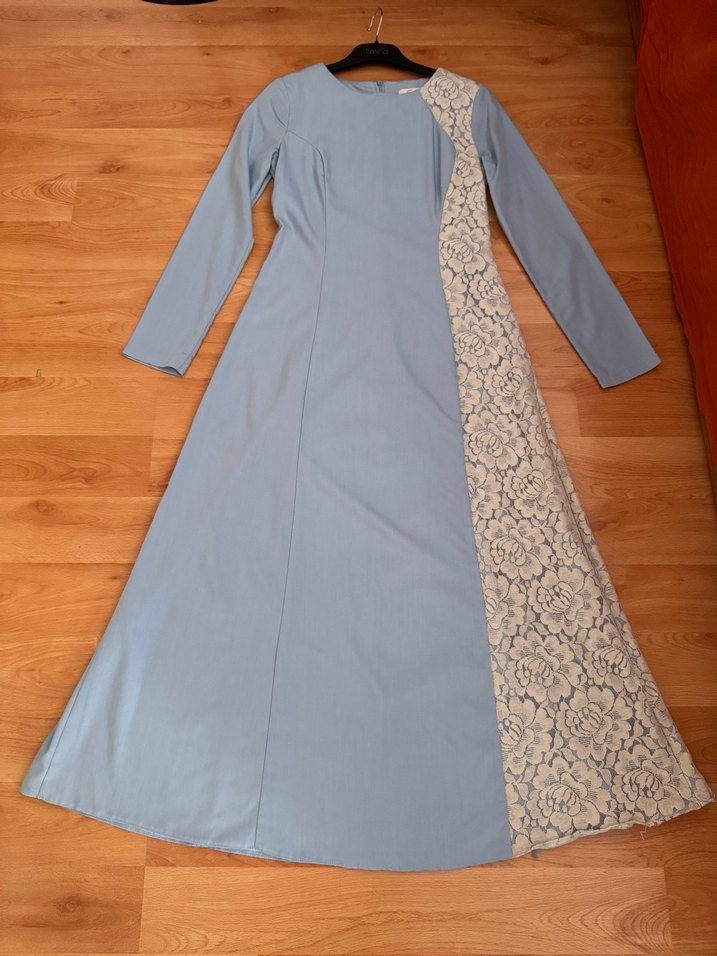 Vintage tarzda, uzun kollu ve regular fit mavi elbise. Sentetik kumaştan, gri çiçekli dantel detaylı, düğünler için uygun.