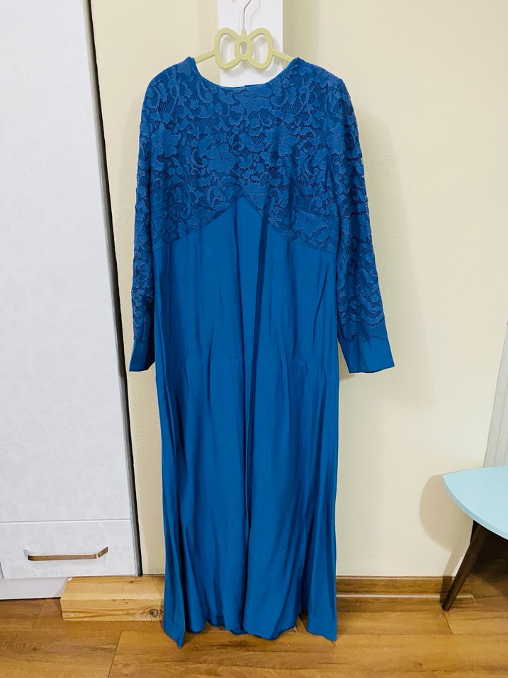 Koyu mavi uzun elbise, bol kesim ve uzun kolludur. V yaka, üst kısmında vintage dantel detayları ve ipeksi dokusu vardır. Düğün için uygundur.