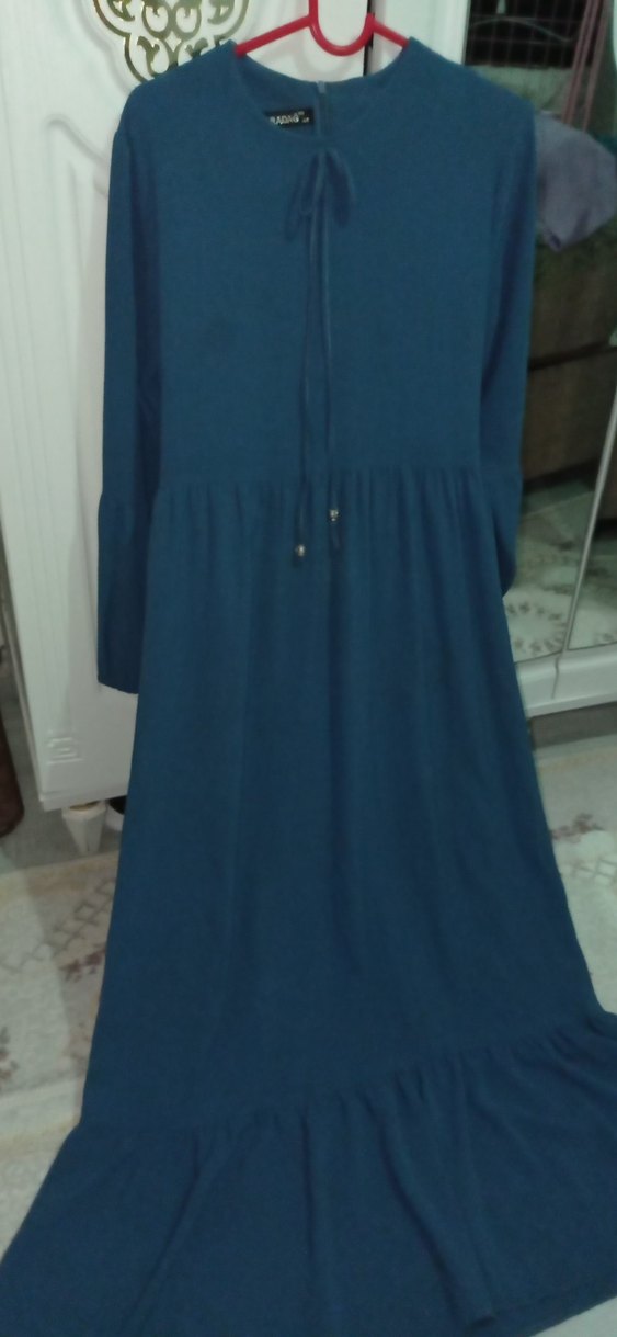 Koyu mavi uzun elbise, uzun kollu ve bol kesimdir. Volan detayları ve yuvarlak yaka bulunur. Minimalist, sade ve mütevazı stil sunar. Yumuşak sentetik kumaştan üretilmiştir.