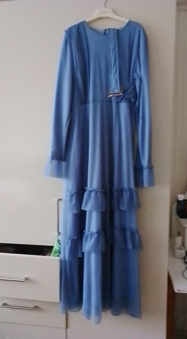 Yüksek yakalı, bol kesim uzun mavi elbise, yumuşak sentetik kumaştan ve volan detaylıdır. Uzun kollu, vintage bohem tarzındadır.
