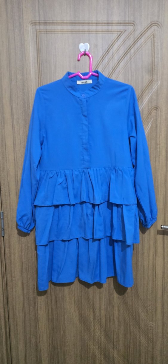 Yüksek yakalı, uzun kollu mavi tunik, bol kesim ve kat kat volan detaylarla renkli ve minimalist sokak modası tarzında. Yumuşak sentetik kumaştan, günlük kullanıma uygun.
