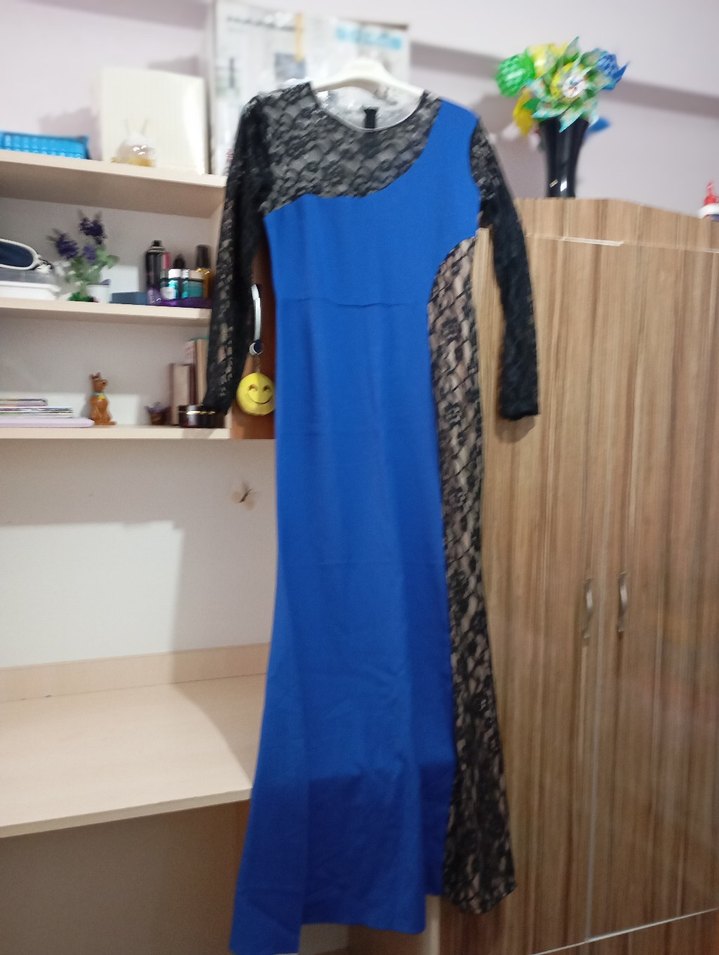 Uzun Kollu Mavi Yılan Desenli Elbise