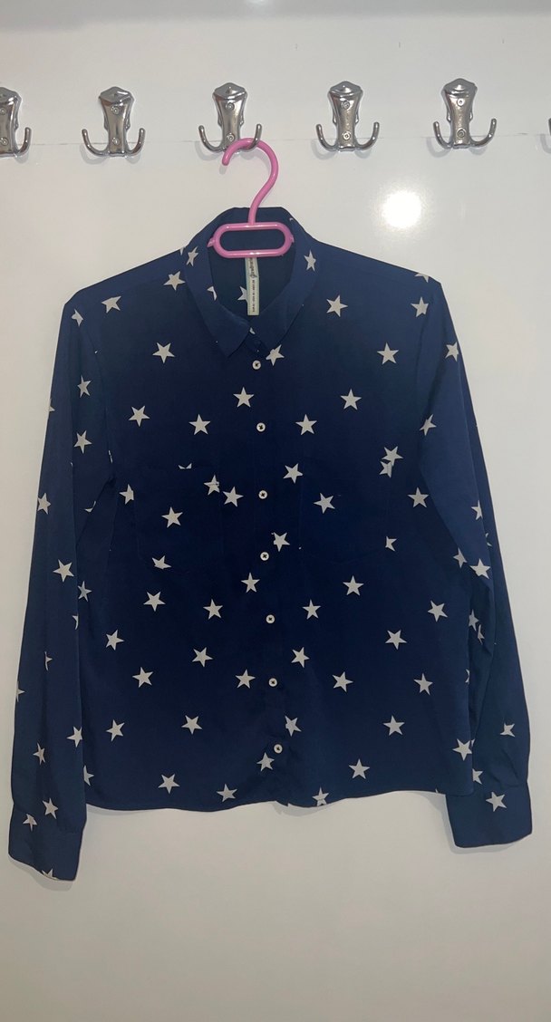 Mavi renkte, yıldız desenli, düğmeli, yakalı ve bol kesim uzun kollu gömlek. Sentetik kumaştan, günlük rahat sokak stili için uygun.