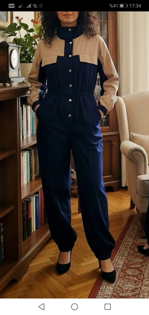 38 Beden, Lacivert ve Sütlü kahve renk bloklu, uzun kollu, hem gizli fermuarli hem metal çıtçıtlı, dik yakalı bol kesim kadın kumaş tulum. Yumuşak kumaș. Hic giyilmedi. Kaçırmayın #tulum #trendyol #elbise #tshirt #shirt #ayakkabı #canta #mont #makyaj #parfum #etek #ceket #tarz #moda