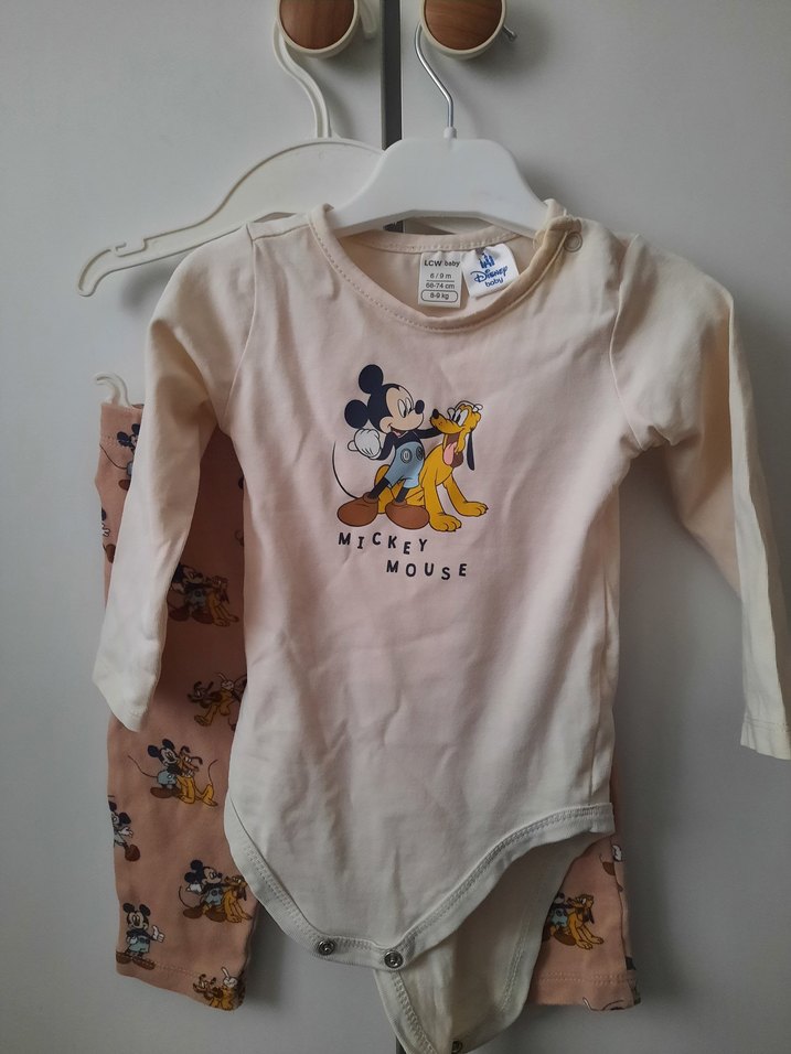 Uzun kollu beyaz bodysuit üzerinde Mickey Mouse ve Pluto baskısı, çıtçıtlı, pastel desenli pantolonla takım halinde.#erkek bebek #kız bebek