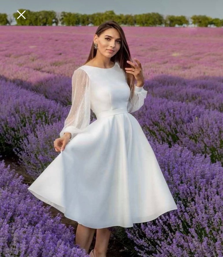 Bu beyaz midi gelinlik, uzun tül kollar ve straplez yakası ile bohem tarzda, klasik zarif bir görünüm sunar. Hiç kullanılmadı alındığı gibi duruyor